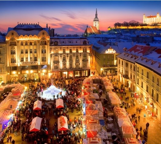 Polazak autobusa predviđen je u jutarnjim satima. Slijedi ugodna vožnja uz kraća usputna zaustavljanja prema Bratislavi – gradu bogate povijesti i kulture, čiji je stari dio središte brojnih događanja tijekom cijele godine. Po dolasku razgled započinjemo odlaskom do Bratislavskog dvorca, smještenog na brežuljku iznad Dunava, s kojeg se pruža prekrasan panoramski pogled na grad. Posebnost ove lokacije je i mogućnost da s jedne točke obuhvatite pogledom čak tri države – Austriju (3 km), Mađarsku (13 km) i Slovačku. Kroz slikovite vrtove dvorca spuštamo se prema Starom gradu, gdje slijedi razgled najvažnijih znamenitosti: Katedrala sv. Martina, vrata sv. Mihaela, Glavni trg s Rolandovom fontanom, Stara vijećnica, Slovačko narodno kazalište i Hviezdoslavov trg. Nastavljamo šetnju do jedinstvene Plave crkve sv. Elizabete, potom do novog zdanja Slovačkog narodnog kazališta te šetnju završavamo uz Dunavsku promenadu u središtu grada. Nakon razgleda slijedi slobodno vrijeme za uživanje u čaroliji adventskog sajma, smještenog na tri trga – Glavnom, Franjevačkom i Hviezdoslavovom. Ovdje vas očekuje bogata ponuda: klizalište, glazbeni nastupi, brojni štandovi s ručno izrađenim suvenirima te raznolika gastronomska ponuda, među kojom se posebno izdvajaju Ciganska pečienka, lokše i medovina. Po želji grupe moguć je i odlazak na vidikovac UFO (uz doplatu), s kojeg se pruža veličanstven pogled na dvorac, stari grad, Dunav i mostove koji povezuju njegove obale. Povratak je predviđen u kasnim večernjim satima.